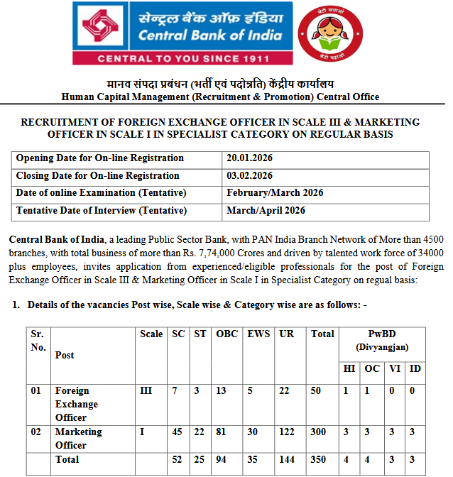 Central Bank of India Officer Recruitment 2026: Apply for 350 Specialist Posts