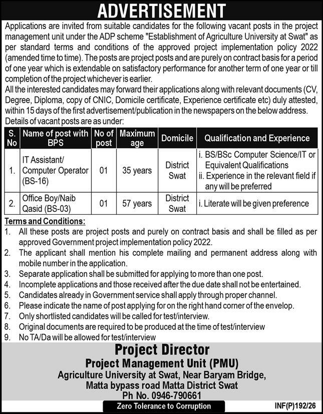 Jobs in pakistan, pakistan jobs, government jobs in pakistan, PMU Swat jobs 2026, IT Assistant vacancies KPK, Computer Operator jobs Swat, Naib Qasid and Office Boy recruitment, Swat management careers, Express newspaper job alerts, Khyber Pakhtunkhwa government jobs, primary and middle pass jobs Swat.