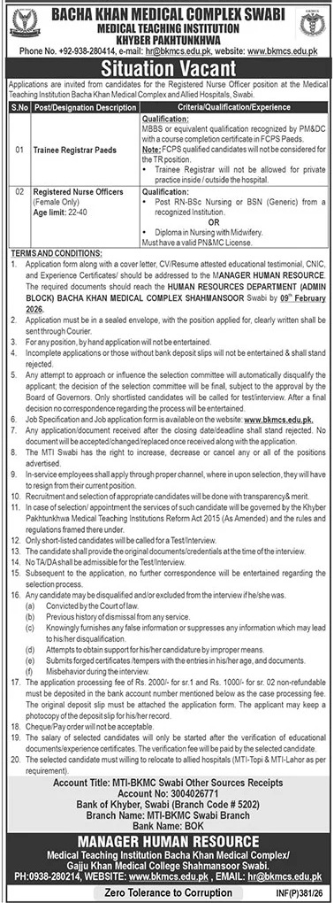 Bacha Khan Medical Complex (BKMC) Swabi Medical Jobs 2026