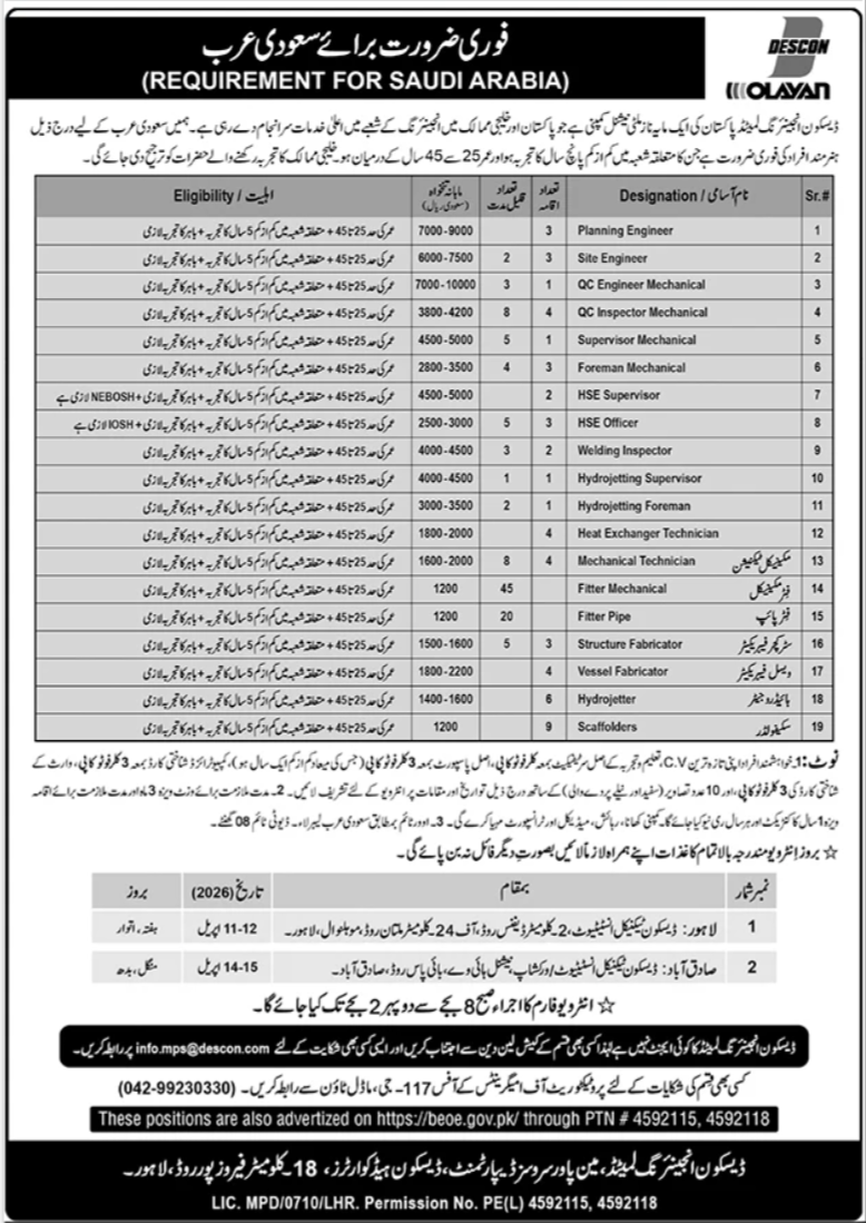 Are you looking for international manufacturing careers? Descon Engineering Limited has announced several vacancies in Riyadh, Saudi Arabia. As per the Daily Jang advertisement dated April 5, 2026, they are hiring skilled staff for various technical and supervisory roles. You can find more details about these Jobs in Pakistan and overseas on our portal, Government Jobz.