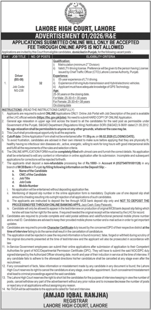 Interested candidates should visit the official Lahore High Court Official Website to download the application forms or check for the online portal link. Ensure you have your driving license and educational certificates ready before the last date of February 06, 2026.