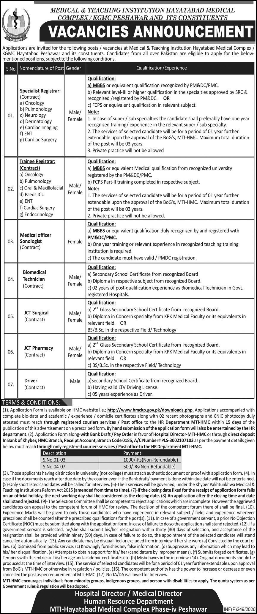 Tags: MTI Peshawar jobs 2026, HMC Peshawar vacancies, KGMC recruitment, Medical Officer jobs Hayatabad, Biomedical Technician jobs KPK, Specialist Registrar vacancies, Express newspaper jobs today, KPK medical teaching jobs.