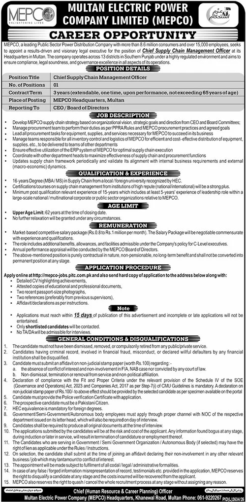 Multan Electric Power Company is seeking an experienced professional for the post of Chief Supply Chain Management Officer.