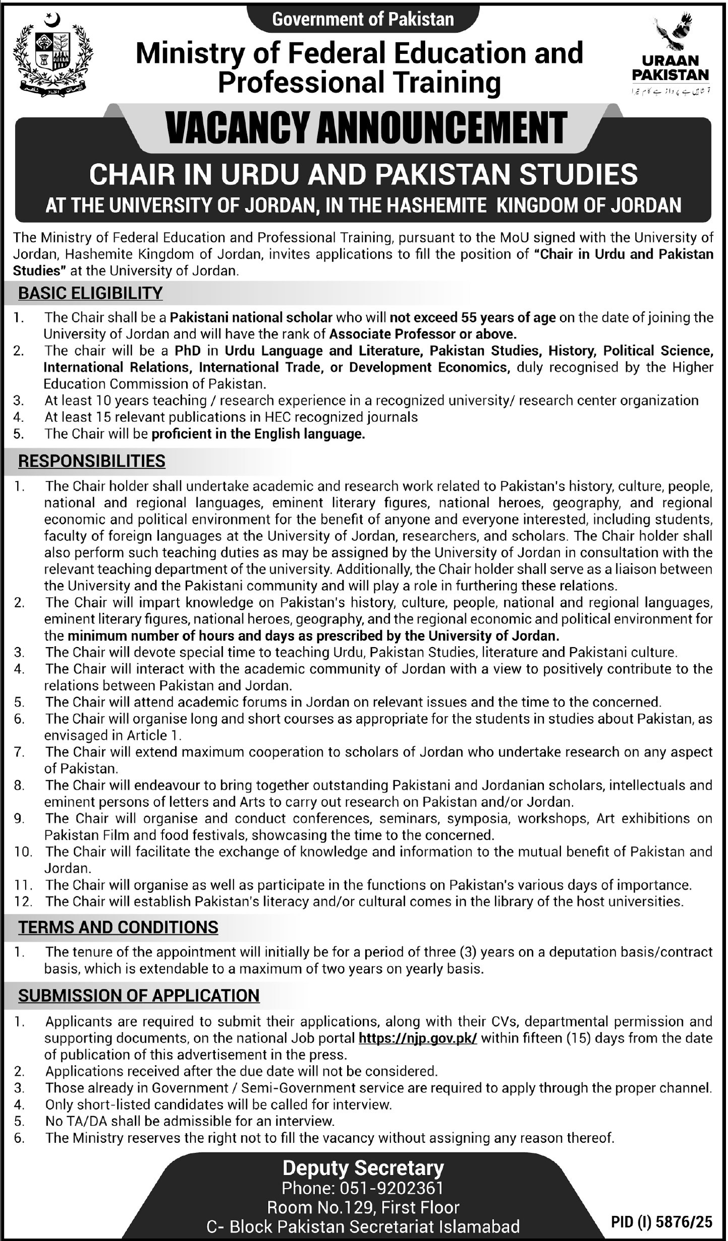 Preference will be given to candidates holding a PhD in Education Planning, Public Administration, Social Sciences, or relevant technical fields from HEC-recognized institutions. Significant experience (15–17 years) in senior management or academic leadership is generally mandatory for these “Chair” level appointments.