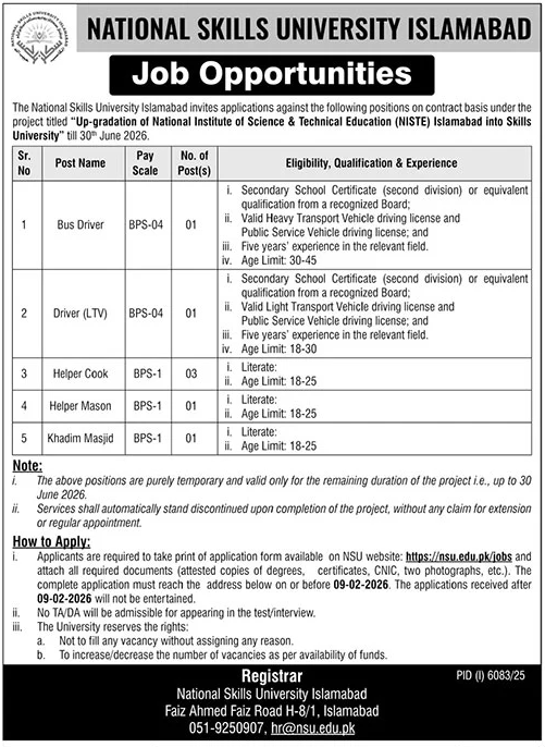 Jobs in pakistan, pakistan jobs, government jobs in pakistan, pakistan jobs, remote jobs in pakistan, online jobs in pakistan, National Skills University jobs 2026, NSU Islamabad vacancies, Driver jobs in Islamabad, H-8 Islamabad jobs, Matric base jobs in Pakistan, Primary pass government jobs, management jobs in Islamabad, latest university jobs 2026, hospital and university staff jobs.