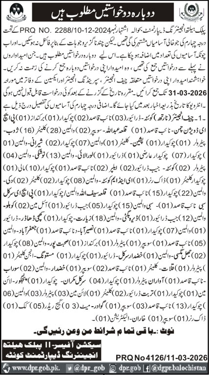 Individuals with Primary, Middle, or Matric qualifications are eligible to apply for these Government Jobz. These full-time roles are perfect for those seeking stable Balochistan Jobs in the public service sector.