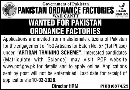 Pakistan Ordnance Factories (POF) Wah Cantt Jobs 2026