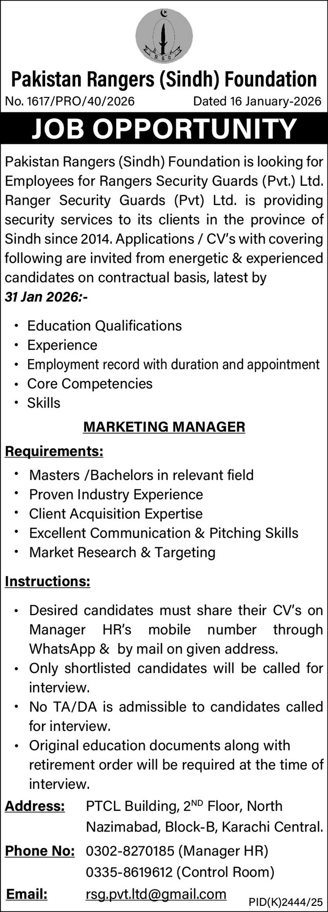 Pakistan Rangers is currently seeking an experienced and motivated individual for the post of Marketing Manager. This role falls under Management Jobs and requires a candidate with strong leadership and communication skills. For more information on similar roles in the uniformed forces, visit Government Jobz regularly.