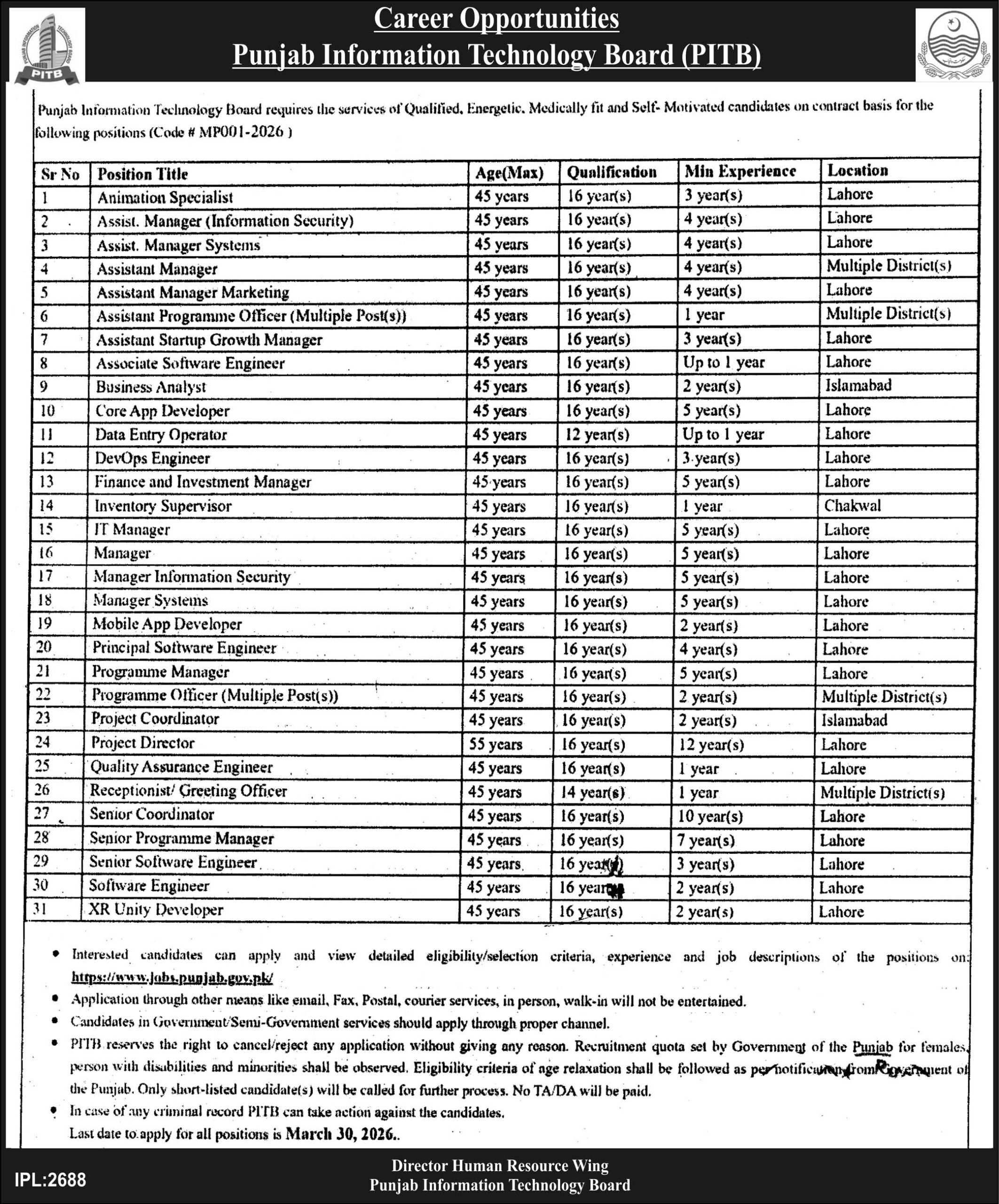 Interested candidates can find more details on Government Jobz. Applicants must submit their applications by March 30, 2026, or as mentioned in the official newspaper advertisement. For a smooth application process, visit the official PITB Website or use the Punjab Jobs Portal.