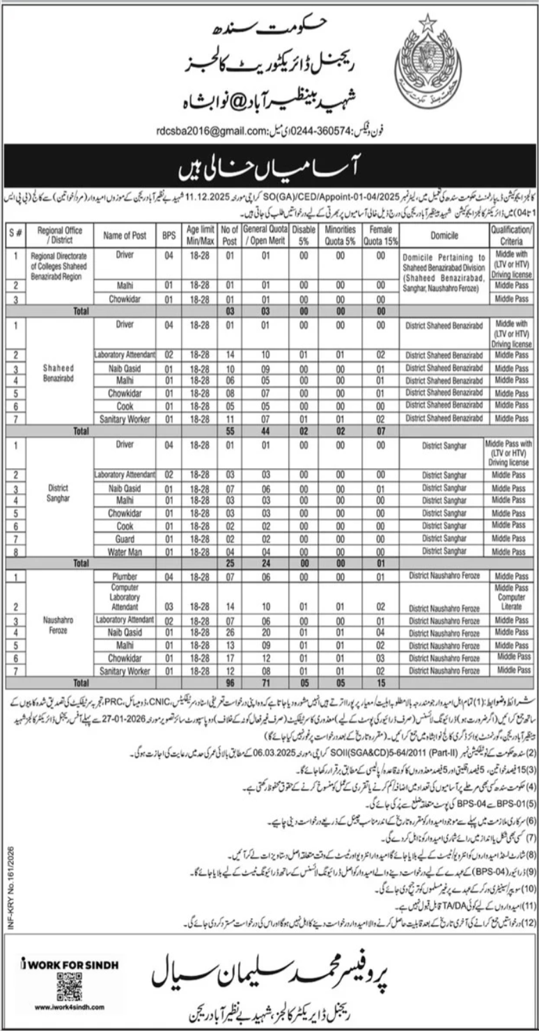 The Regional Directorate of College in Nawabshah (Shaheed Benazirabad) has announced multiple vacancies for support and technical staff within the college education system. As advertised in Daily Jang on January 17, 2026, these positions offer full-time government employment for local residents with a Middle-level education.