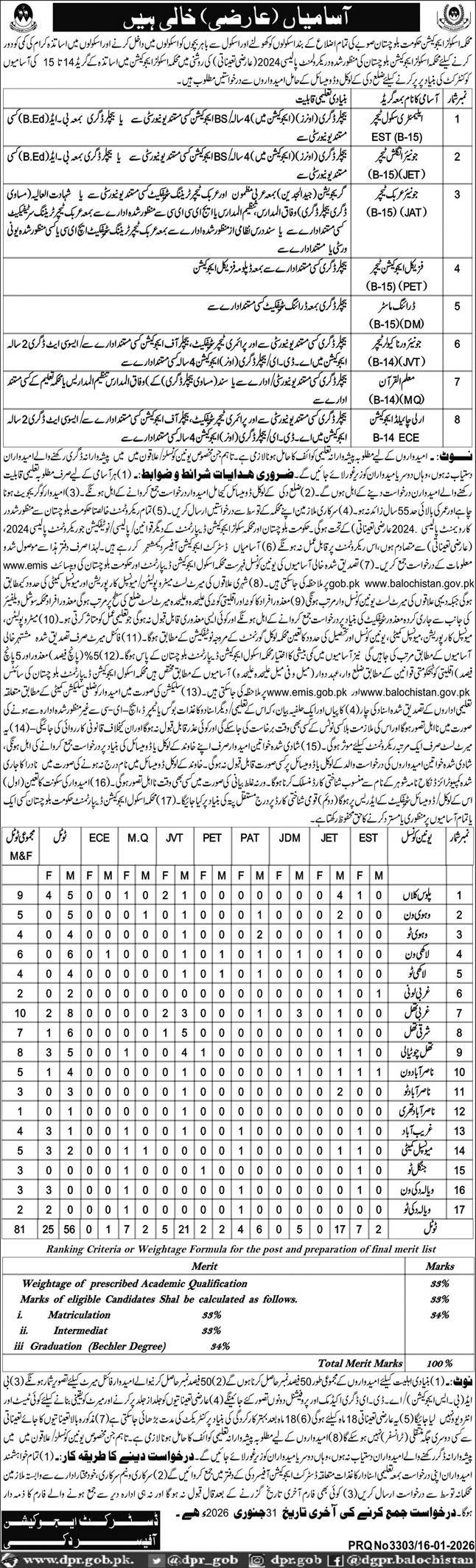 The School Education Department has announced a wide range of teaching opportunities for District Duki. According to the advertisement published in the Daily Express on January 17, 2026, the department is seeking qualified and dedicated educators to fill various technical and general teaching positions across the district.