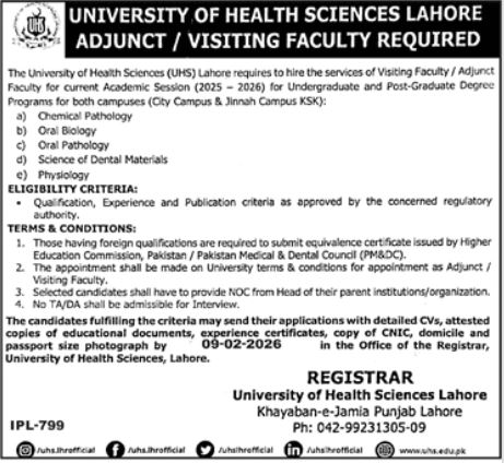 UHS Lahore Faculty Jobs 2026: Adjunct & Visiting Faculty Vacancies